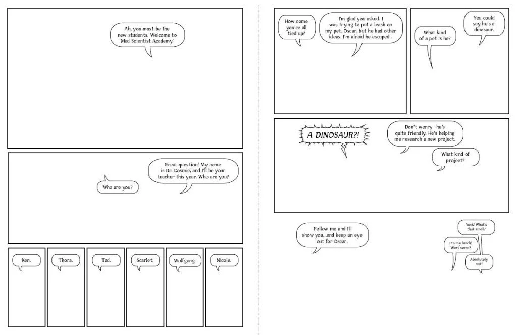 Step 2: Next, I have to figure out how to fit the story into exactly thirty-two pages. I have to decide how much text will go on each page, how many panels I should use, and which parts of the story should have big or small pictures. I use a program called InDesign to create a basic layout of the whole book with just word balloons and empty boxes.