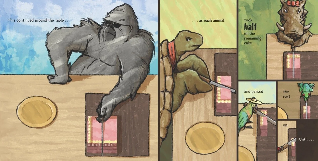 When the ant receives a special invitation to dine with the lion, she is ready to be on her best behavior. During dessert, the other guests do not mind their manners, each one taking half the remaining cake as it is passed around. By the time it reaches the ant, barely a crumb is left for her to share with the King. What to do?