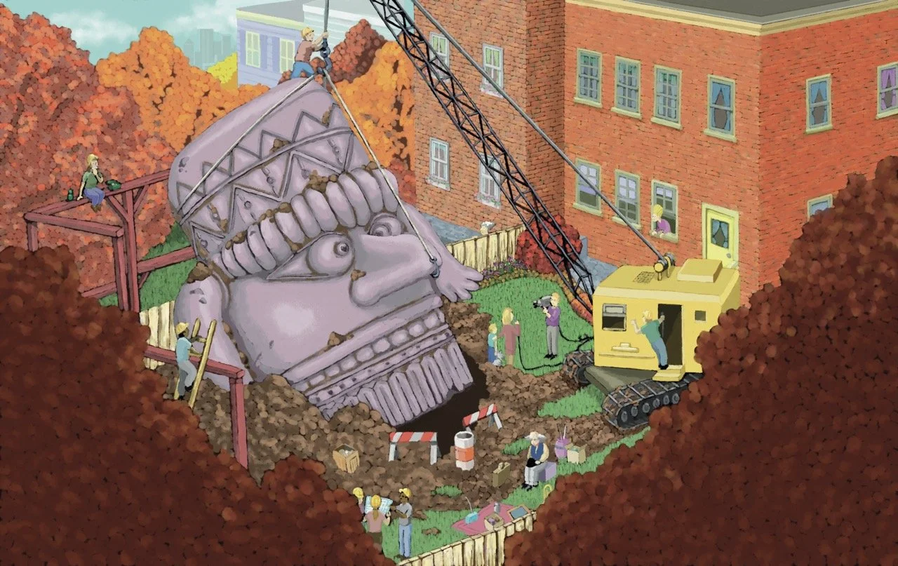 “Eccentric Uncle Frank comes to visit and literally makes himself at home. He begins to dig a pit in his relatives’ middle-class urban back yard, searching first for dinosaur bones, then for oil, and eventually for treasure. Oblivious to his family’s disbelief (excluding the boy who narrates the story), and later intense media coverage, he ends up unearthing a huge ancient statue. Uncle Frank has the manic good cheer of an updated Monsieur Racine (Tom Ungerer’s The Beast of Monsieur Racine, Farrar, 1971) but is revealed in contemporary, vivid, and thoroughly wacky full-color art. Surprises enliven the book as Uncle Frank moves furniture and amenities into the pit and has a hot tub installed. Emphatic characters are notable for their angular hairstyles, and the spot art is irresistible apropos. Original and endearing, the text and illustrations support one another seamlessly. Best of all, the offbeat protagonist proves himself right against all logical odds. Children will regret his departure and hope he’ll be back soon.”