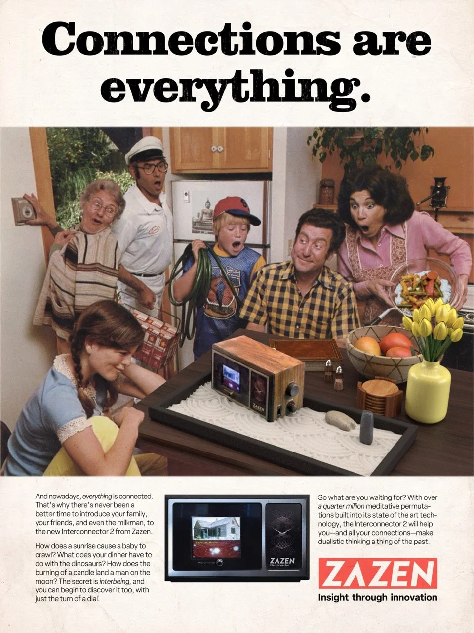 In the early 1970s, Zazen began work on their most ambitious product yet: the Interconnector Model 1. This machine would receive special broadcasts on the UHF frequency, which it could display in a split-screen format on a tiny TV screen. The user could tune in different channels on the sub-frequency and juxtapose seemingly unrelated broadcasts next to one another. Through this, the viewer was challenged to consider the interconnected nature of the world.